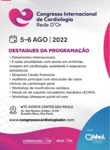 Congresso Internacional de Cardiologia – Rede D`Or – 05 a 06 de agosto 2022 (SP)Garanta sua vaga no Congresso Internacional de Cardiologia Rede D’Or. O evento foi planejado para oferecer aplicação prática do conhecimento por meio de discussões interativas de casos clínicos, palestras e workshops. Será uma oportunidade para o aprofundamento em temas de grande relevância para o dia a dia da assistência. Tudo isso com convidados nacionais e internacionais, além de estandes com tecnologias de última geração e lançamentos. Todas as medidas sanitárias serão tomadas para que os participantes desfrutem de um ambiente científico, social e saudável. Acesse agora: https://www.congressocardiologiador.com/