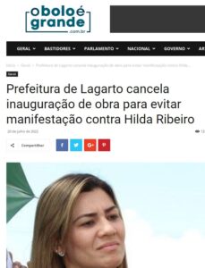 Prefeitura de Lagarto cancela inauguração de obra para evitar manifestação contra Hilda Ribeiro Fonte: Portal O Bolo é Grande: “Nessa terça-feira, 19, a Prefeitura de Lagarto cancelou a inauguração de um calçamento no Povoado Brasília, após informações de que a prefeita Hilda Ribeiro seria recebida por manifestantes. Segundo relatos de moradores, a prefeitura pavimentou duas ruas, mas não calçou a travessa que fica no meio dessas ruas. Os moradores vizinhos estão sendo prejudicados, pois a água que vem das ruas pavimentadas, acaba indo para a travessa, piorando o lamaçal no local.Revoltados, os moradores organizaram uma manifestação para reclamar uma solução, algo que não aconteceu, já que a gestão ficou sabendo do ato contra Hilda, e preferiram evitar o constrangimento. O secretário Municipal de Obras, Igor Batata, também era esperado, a fim de tomar providências cabíveis para solucionar o problema gerado.”