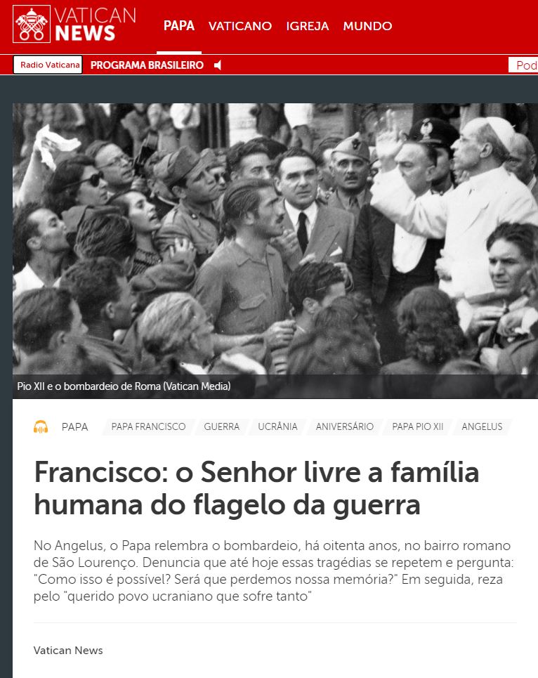 Após a oração mariana do Angelus este 16 de julho, XV Domingo do Tempo Comum, o Papa quis recordar “que há oitenta anos, em 19 de julho de 43, alguns bairros de Roma, especialmente São Lourenço, foram bombardeados”. O trágico aniversário foi para o Pontífice a ocasião, mais uma vez, para renovar o “não” à guerra e à perda da memória histórica. “Será que perdemos nossa memória?” Ouça a reportagem com a voz do Papa e compartilhe: https://www.vaticannews.va/pt/papa/news/2023-07/papa-francisco-angelus-bombardeio-sao-lourenco-roma-80-anos.html