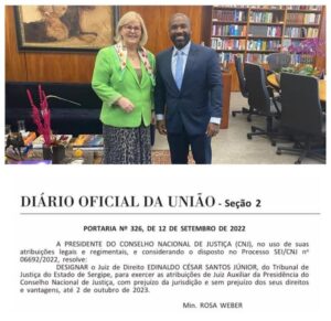 Juiz do TJSE nomeado por Rosa Weber juiz auxiliar da presidência do Conselho Nacional de Justiça E o juiz do Tribunal de Justiça do Estado de Sergipe, Edinaldo César Santos Júnior, foi nomeado na última segunda-feira, 12, como juiz auxiliar do Conselho Nacional de Justiça pela nova presidente, a ministra e presidente também do STF, Rosa Weber. Entre os colegas do TJSE a nomeação foi aplaudida porque Edinaldo é considerado um magistrado que enobrece o judiciário brasileiro.