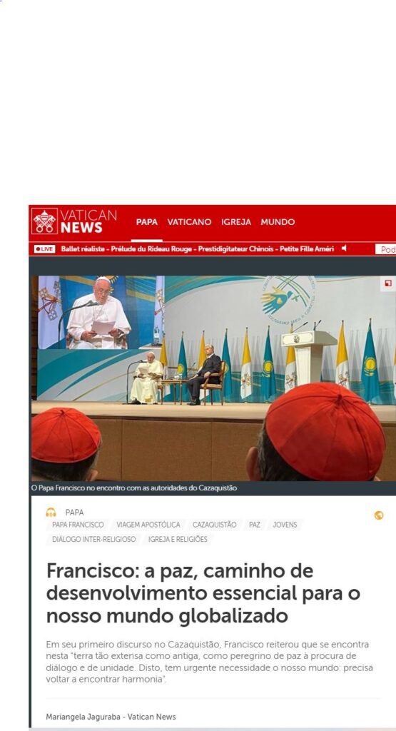O Papa Francisco se encontra no Cazaquistão, no âmbito de sua 38ª viagem apostólica internacional. Nesta terça-feira (13/09), o Papa se encontrou com as autoridades, a sociedade civil e o Corpo Diplomático na Qazaq Concert Hall, em Nur-Sultan, capital do Cazaquistão. Ouça e compartilhe: