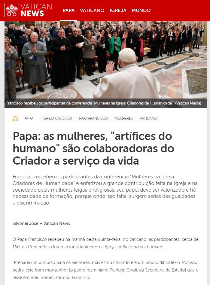 Obrigado por sua presença e por organizar e promover esse evento. Evento, disse o Papa que destaca particularmente o testemunho de santidade de dez mulheres. Gostaria de nomeá-las: Josephine Bakhita, Magdeleine de Jesus, Elizabeth Ann Seton, Maria MacKillop, Laura Montoya, Kateri Tekakwitha, Teresa de Calcutá, Rafqa Pietra Choboq Ar-Rayès, Maria Beltrame Quattrocchi e Daphrose Mukasanga. Aqui toda matéria: