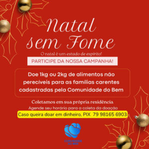 Natal sem Fome da Comunidade do Bem. Convite especial para abençoar famílias neste Natal. Pode doar 1kg ou 2kg de alimentos e fazemos a coleta na própria residência, ou se desejar, pode doar por meio de dinheiro através do PIX 79 98165 6903. Gratidão e que Deus te abençoe grandemente. Siga nosso Instagram: