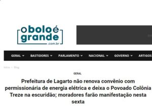 Prefeitura de Lagarto não renovou convênio com permissionária de energia elétrica, deixando o Povoado Colônia Treze na escuridão; moradores farão manifestação nesta sexta Deu no site O Bolo é Grande: “A Prefeitura de Lagarto não renovou o convênio com a Cooperativa de Eletrificação e Desenvolvimento Rural Centro Sul de Sergipe (CERCOS), que é a permissionária de energia elétrica do Povoado Colônia Treze, ocasionando constantes apagões há cerca de três meses na região, além de vários postes sem funcionar. O presidente da CERCOS, Aroldo Costa, participou nesta quinta-feira, 21, do Programa Sergipe em Destaque, 102.7 FM, e disse que a gestão da prefeita Hilda Ribeiro foi notificada em abril sobre o fim do contrato. “A prefeitura foi notificada no dia 19 de abril, mas somente ontem fomos recebidos pela gestão”, afirmou. O apresentador Aclécio Prata perguntou se a CERCOS poderia fazer algo para amenizar o problema. “Infelizmente não, porque só podemos trabalhar mediante convênio”, respondeu. Diante da problemática, os moradores da Colônia Treze irão realizar uma manifestação amanhã, sexta-feira, reivindicando que a prefeitura assine o convênio.”