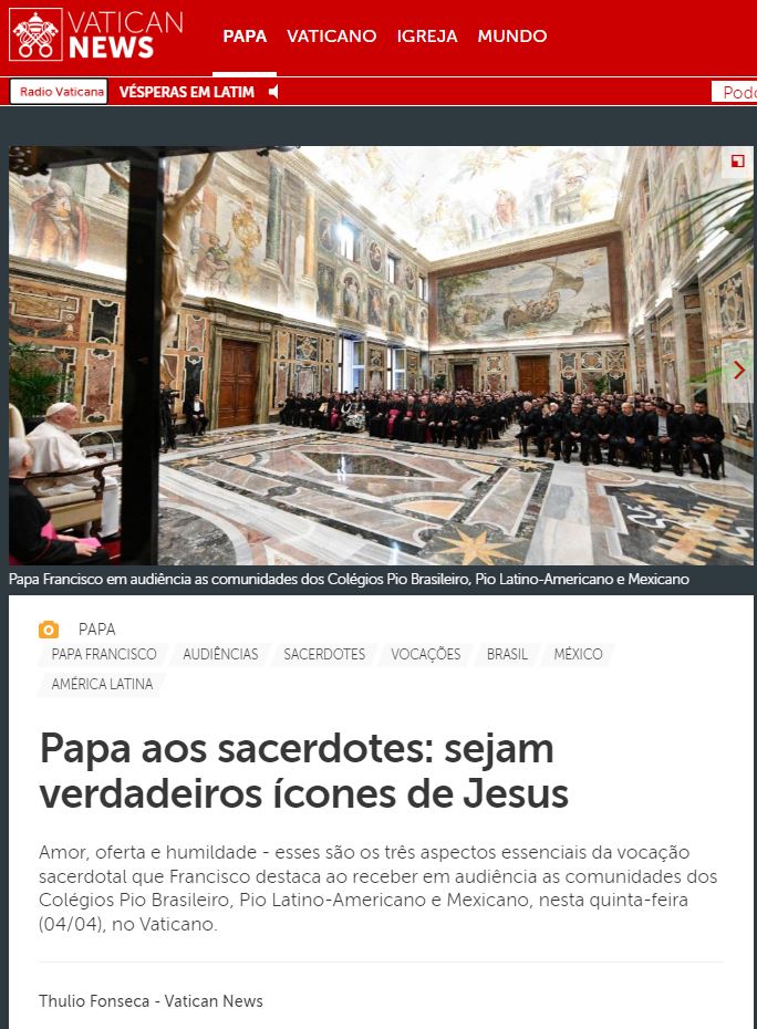 Na manhã desta quinta-feira, 4 de abril, o Papa Francisco recebeu na Sala Clementina, no Vaticano, os sacerdotes dos Colégios Pio Brasileiro, Pio Latino-Americano e Mexicano. Grande parte dos padres são estudantes, enviados por suas dioceses ou institutos religiosos, para cursos, mestrados e doutorados nas universidades pontifícias de Roma. Ocasião ainda mais significativa para os cem membros do Colégio Pio Brasileiro, que nesta semana celebrou seus 90 anos de fundação. Aqui toda matéria: https://www.vaticannews.va/pt/papa/news/2024-04/papa-sacerdotes-colegios-pio-brasileiro-latinoamericano-mexicano.html