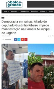 Antidemocrata E conclui a matéria: “Contudo, no momento em que o morador do Jenipapo abriu o cartaz no espaço reservado ao público, Beiju das Bandeiras de forma truculenta e agressiva tomou o cartaz e o rasgou proferindo impropérios. É imprescindível lembrar que não há nada no regimento interno que proíba a manifestação silenciosa. Inclusive o referido cidadão questionou a Mesa Diretora se era permitido esse tipo de manifestação popular. A atitude do aliado do deputado Gustinho demonstra o nível de política antidemocrática em Lagarto, estimulada pela situação, ferindo ainda, a liberdade expressa na Constituição Federal de qualquer cidadão se manifestar livremente.” Fonte: Site O Bolo é Grande.