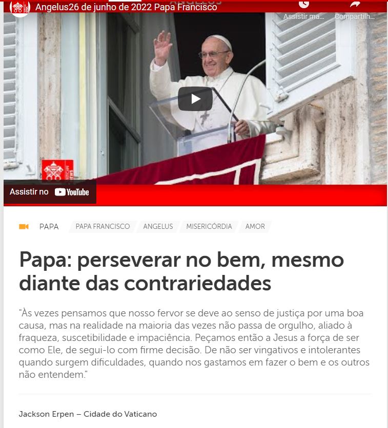 Com a ajuda da Virgem Maria, tomar a firme decisão de Jesus de permanecer no amor até o fim, de não sermos vingativos e intolerantes quando surgem dificuldades. Este foi o pedido do Papa Francisco antes de rezar o Angelus neste XIII Domingo do Tempo Comum, dirigido aos milhares de fiéis e turistas provenientes de várias partes do mundo, reunidos na Praça São Pedro sob forte calor. para o tradicional encontro dominical. Ouça e compartilhe: https://www.vaticannews.va/pt/papa/news/2022-06/papa-francisco-angelus-xiii-domingo-tempo-comum-26-junho-2022.html