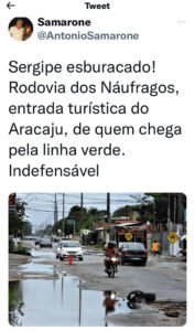 www.twitter.com/AntonioSamarone Sergipe esburacado! Rodovia dos Náufragos, entrada turística do Aracaju, de quem chega pela linha verde. Indefensável