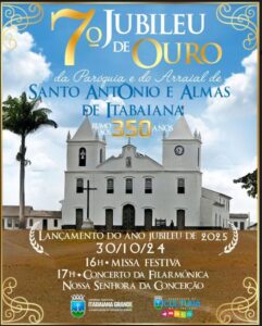 7º Jubileu de Ouro da Paróquia e do Arraial Santo Antônio e Almas de Itabaiana. Lançamento do Ano Jubileu de 2025. Rumo aos 350 anos. Dia 30 de Outubro: 16h, Missa Festiva; 17h, Concerto da Filarmônica Nossa Senhora da Conceição.
