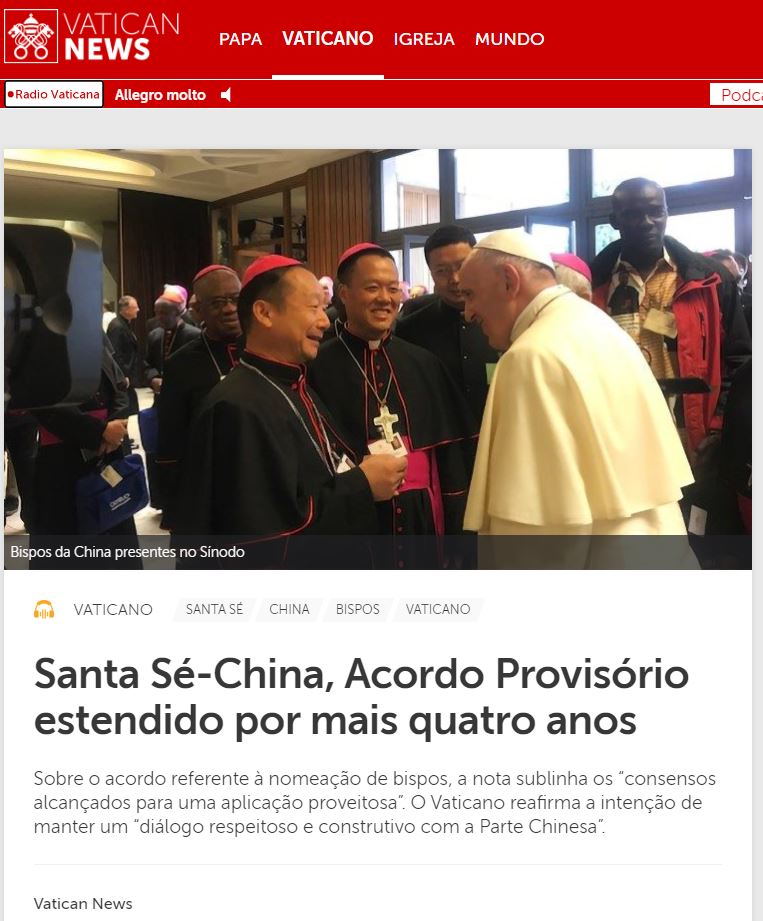 Esta é a terceira renovação de um acordo que, com a assinatura de 22 de setembro de 2018, abriu uma página histórica nas relações entre a Santa Sé e a República Popular da China, e também no coração da própria Igreja desse grande país oriental, permitindo que todos os bispos estejam em plena comunhão hierárquica com o Papa. A nova assinatura, realizada pelas duas partes sobre o Acordo Provisório – cuja validade entra em vigor a partir de hoje (22/10) pelos próximos 4 anos – segue aquela da primeira renovação por um biênio ocorrida em 2020, e a seguinte, para um segundo biênio, assinada exatamente em 22 de outubro de 2022. Aqui: https://www.vaticannews.va/pt/vaticano/news/2024-10/santa-se-china-acordo-provisorio-estendido-por-mais-quatro-anos.html