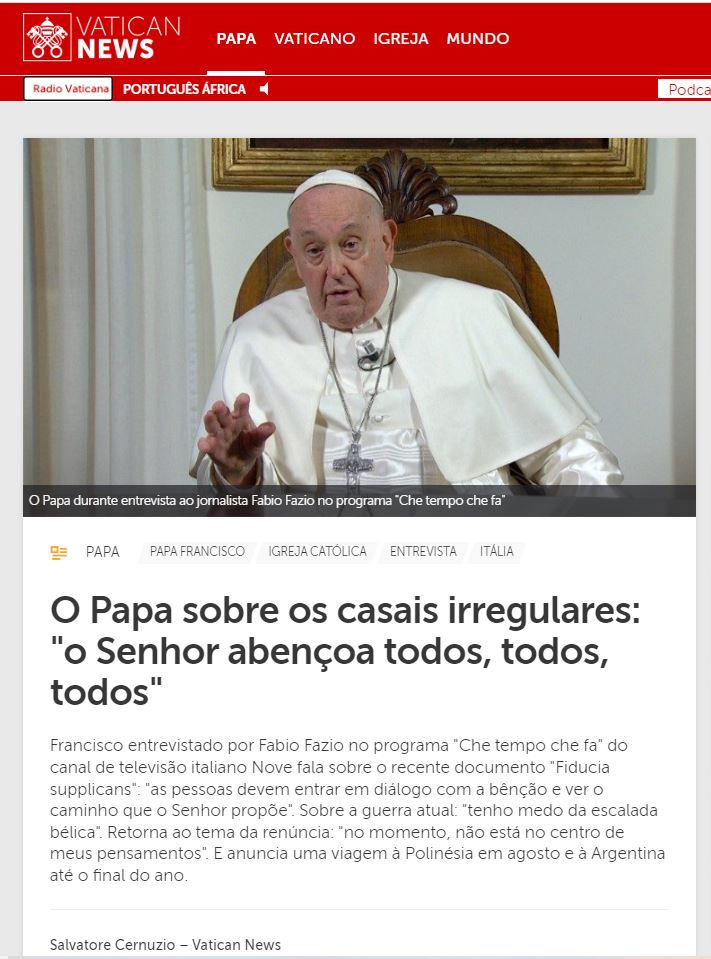 Bênçãos para todos, também aos casais “irregulares”, imitando Deus que é “bom” e não “castigador” e “abençoa todos, todos, todos”; o “medo” de uma escalada bélica e da capacidade de “autodestruição” da humanidade; a confirmação de que não tem intenção de renunciar e o anúncio de duas viagens: à Polinésia, em agosto, e à sua terra natal, a Argentina, no final do ano. Esses são alguns dos temas tratados pelo Papa em sua entrevista ao jornalista Fabio Fazio para o programa italiano Che tempo che fa, transmitido na noite deste domingo, 14 de janeiro, no canal Nove. Em 2021, Francisco já havia concedido uma entrevista ao mesmo popular programa (na época transmitido pela RAI); neste domingo, uma nova entrevista com duração de menos de uma hora para refletir sobre assuntos relacionados à atualidade, aos desafios do mundo, à Igreja e ao pontificado. Em: