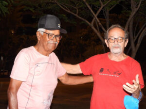 Luciano comemorou com Horácio essa lembrança. “Foi a minha maior emoção futebolística”, revelou Cibalena. Na foto, Cibalena está contando os detalhes dessa partida, ao espantado Horácio.