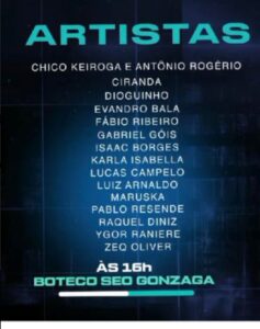 Show beneficente neste domingo, 09 Do cantor e compositor sergipano Fábio Ribeiro: “Nesse domingo eu e Grandes Artistas do nosso cenário, estaremos nos apresentando no palco do Boteco Seo Gonzaga – https://www.instagram.com/botecoseogonzaga/, a partir das 16 horas, para um show mais que especial. O show “TRAZ DE VOLTA”, é um evento beneficente, em prol do nosso querido amigo Diego Valente https://www.instagram.com/diegovalenteoficial/ , que passa por uma situação complicadíssima de saúde, e por consequência financeira também. Nesse evento, todo o dinheiro arrecado será repassado para essa causa, por isso sua presença é essencial. Imagine que além de você desfrutar dessas grandes atrações, você também estará ajudando nessa causa. SERÁ COBRADO COUVERT (R$10,00) E COLOCADO UMA CAIXINHA EXTRA, PARA QUEM QUISER COLABORAR COM VALOR ACIMA DESSE VALOR. Contato para reservar mesas, caso prefiram: 79999171800.”