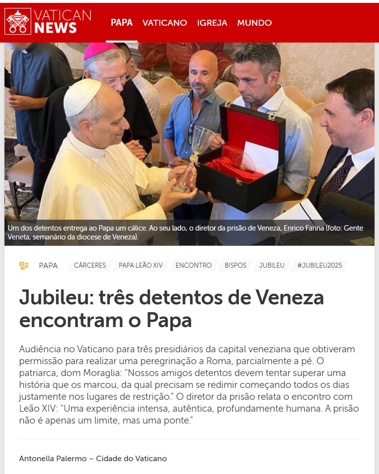 “Um encontro muito cordial, muito fraterno, não formal. Não houve discursos preparados.” O patriarca de Veneza, Francesco Moraglia, relatou aos meios de comunicação do Vaticano a audiência concedida na quinta-feira, 7 de agosto, na Sala do Consistório do Palácio Apostólico, por Leão XIV a um grupo de peregrinos, entre os quais estavam três detentos da Casa de Detenção de Santa Maria Maggiore, em Veneza, que chegaram ontem a Roma após partirem da etapa intermediária em Terni, de onde prosseguiram a pé por cinco dias até a capital. Os três presidiários, explica o bispo, mesmo sob regime de restrição, puderam usufruir da permissão do magistrado para viver uma experiência de grande valor em seu caminho de redenção e libertação. No encontro com o Papa, que ocorreu após a passagem pela Porta Santa da Basílica Vaticana, também estiveram presentes o capelão da prisão masculina, padre Massimo Cadamuro; o diretor da prisão, Enrico Farina; o vigário episcopal responsável pela ação caritativa, monsenhor Fabrizio Favaro; e o diretor da Cáritas veneziana, Franco Sensini.