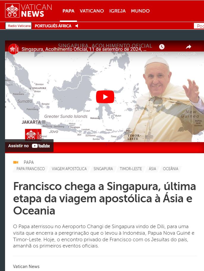 O Papa chegou a Singapura, última etapa da 45ª Viagem Apostólica Internacional de Francisco, a mais longa de seu pontificado, que começou em 2 de setembro e terminará daqui a dois dias, no dia 13, e que o levou à Indonésia, Papua Nova Guiné e Timor-Leste nos últimos dias. Vindo de Díli, o Airbus A320 da Aereo Díli aterrissou no Aeroporto Changi de Singapura às 8h53, horário italiano, 14h53, horário local. Ao pé da aeronave, Francisco, como previsto, foi recebido pelo Ministro da Cultura, Comunidade e Juventude e pelo Embaixador de Singapura junto à Santa Sé, com quem está marcada uma breve conversa, depois da qual, no átrio do Complexo VIP, quatro crianças, dois meninos e duas meninas, deram as boas-vindas ao Papa com uma dança e flores e um grande aplauso coral. O único compromisso de hoje é o encontro privado com os membros da Companhia de Jesus presentes no país, no Centro de Retiros São Francisco Xavier, estrutura em que se realizam retiros espirituais desde 1997, onde o Papa residirá durante sua permanência a Singapura. Aqui a agenda de hoje: https://www.vaticannews.va/pt/papa/news/2024-09/papa-francisco-chegada-singapura-viagem-apostolica-internacional.html