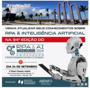 RPA e AI CONGRESS ARACAJU 2024 Instituto Information Management realizará no dia 24 de setembro de 2024, o grande evento em Aracaju sobre RPA – Robotic Process Automation & AI – Artificial Intelligence e seus impactos de transformação nos processos de negócios das empresas. O RPA & AI Congress será realizado em local a ser definido e irá reunir desenvolvedores, consultores, especialistas da indústria e usuários para debater e trocar experiências sobre a força de transformação das tecnologias RPA Robotic Process Automation e AI Artificial Intelligence como ferramentas digitais para o processamento de tarefas com alto grau de rotinas e uso intensivo de mão de obra.