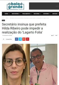Secretário insinua que prefeita Hilda Ribeiro pode impedir a realização do ‘Lagarto Folia’ Deu no site: “O Bolo é Grande”: “Mais uma polêmica – politicagem – do agrupamento do deputado Gustinho Ribeiro. Segundo o secretário de Meio Ambiente de Lagarto, Aloísio Andrade, conhecido como “Prefeitinho”, em seu programa de rádio, na quinta-feira, 16, a prefeita Hilda Ribeiro pode impedir a realização do ‘Lagarto Folia’, programado para os dias 14 e 15 de abril.”