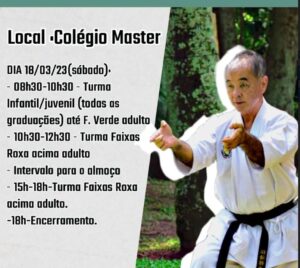 Seminário, dia 18 de Março, também no Colégio Master Já o seminário, terá a participação do mestre famoso no mundo da internet, Hélio Arakaki, um Sensei humilde e que tanto está atraindo seguidores pela sua forma tranquila de passar sua ideia de karatê. O sensei Arakaki está com sua agenda lotada e presenteou os caratecas sergipanos com sua participação em Aracaju. Com certeza, a comunidade carateca poderá desfrutar de um brilhante trabalho num seminário, com um mestre que é 6° Dan da CBK mora em Mato Grosso e foi aluno do grande Mestre Sagara um dos introdutores do karatê no Brasil. Hoje ele é aluno do Sensei Edson Nakama aluno mais velho do Mestre Sagara.