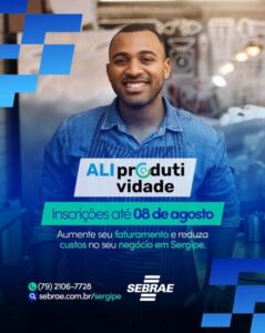 Programa ALI Produtividade. Inscrições até o dia 08 de agosto Se você tem uma Microempresa (ME) ou uma Empresa de Pequeno Porte (EPP) em Sergipe e quer receber acompanhamento GRATUITO do Sebrae/SE, faça parte do Programa ALI Produtividade. O programa busca impulsionar a inovação das empresas, com o objetivo de reduzir os custos e/ou aumentar o faturamento dos negócios. Os Agentes Locais de Inovação (ALI) Produtividade, bolsistas do Sebrae/SE e com experiência de mercado, atuarão diretamente nas empresas para implantar ferramentas ágeis com foco na inovação, além de desenvolverem uma avaliação final para mensurar os resultados para os clientes. As inscrições poderão ser feitas até o dia 08 de agosto de 2023, pelo site do Sebrae Sergipe aqui.