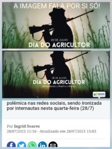 A IMAGEM ELOQUENTE DE UM HOMEM ARMADO VIRALIZOU NAS REDES SOCIAIS E NA MÍDIA DIGITAL, À GUISA DE OPORTUNA PUBLICIDADE OFICIAL EM HOMENAGEM DO ENTÃO DESGOVERNO NAZIFASCISTA DO PAÍS AO AGRICULTOR, NO DIA DESTE, INSINUANDO-LHE TROCAR O CAMPO DE PRODUÇÃO AGRÍCOLA PELO CAMPO DE GUERRA INTESTINA E A MAIS SIMBÓLICA FERRAMENTA DE TRABALHO — A ENXADA — PELA LETAL ARMA DE FOGO.