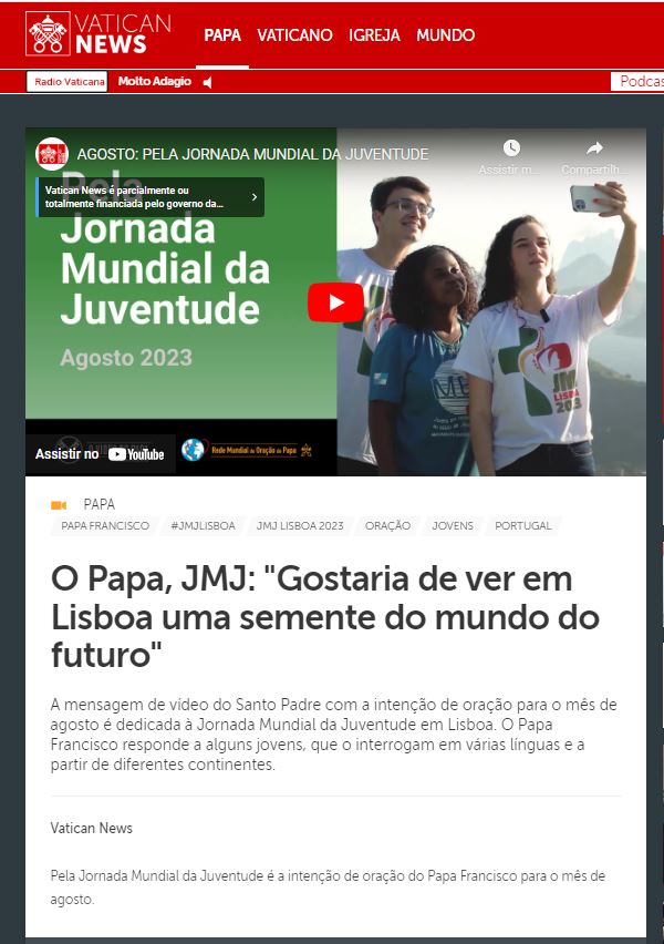 Ouça e compartilhe: https://www.vaticannews.va/pt/papa/news/2023-07/papa-francisco-jmj-semente-mundo-futuro-mensagem-video.html