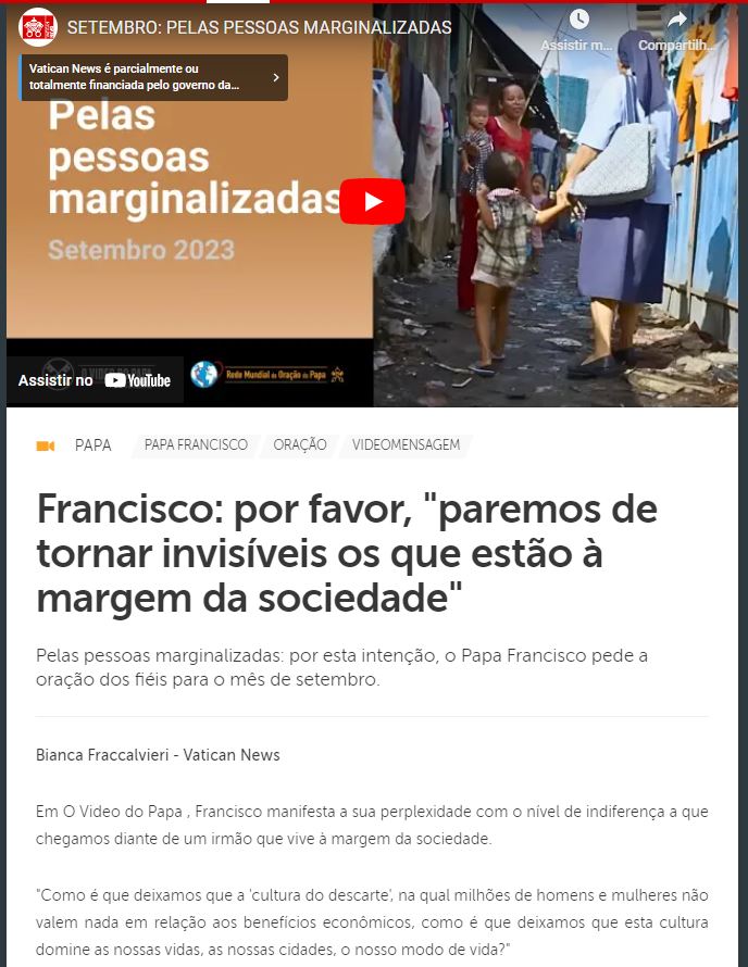 Ouça e compartilhe: https://www.vaticannews.va/pt/papa/news/2023-08/francisco-invisiveis-oracao-setembro.html