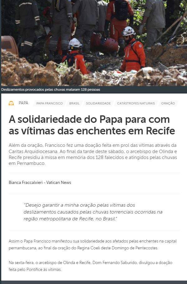 A solidariedade do Papa para com as vítimas das enchentes em Recife. Ouça e compartilhe: