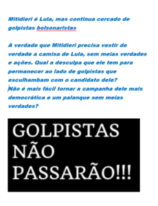 A verdade que Mitidieri precisa vestir de verdade a camisa de Lula, sem meias verdades e ações. Qual a desculpa que ele tem para permanecer ao lado de golpistas que esculhambam com o candidato dele? Não é mais fácil tornar a campanha dele mais democrática e um palanque sem meias verdades?