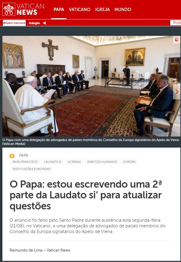 Estou escrevendo uma segunda parte da Laudato si’ para atualizar as questões: foi o que disse o Papa Francisco ao receber em audiência na manhã deste segunda-feira, 21 de agosto, no Vaticano, uma delegação de advogados de países membros do Conselho da Europa signatários do Apelo de Viena, que pede aos Estados membros do Conselho que se comprometam com o Estado de direito e a independência da justiça.