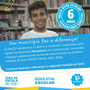 Selo UNICEF destaca município de Macambira por ultrapassar meta estipulada O UNICEF reconheceu o esforço do município de Macambira na garantia do direito à educação de crianças e adolescentes, por meio da implementação da Busca Ativa Escolar, um dos resultados sistêmicos de educação no Selo UNICEF 2021-2024. Nesta primeira medição, o município ultrapassou a meta estipulada, ampliando o acesso à escola e enfrentando a exclusão escolar.