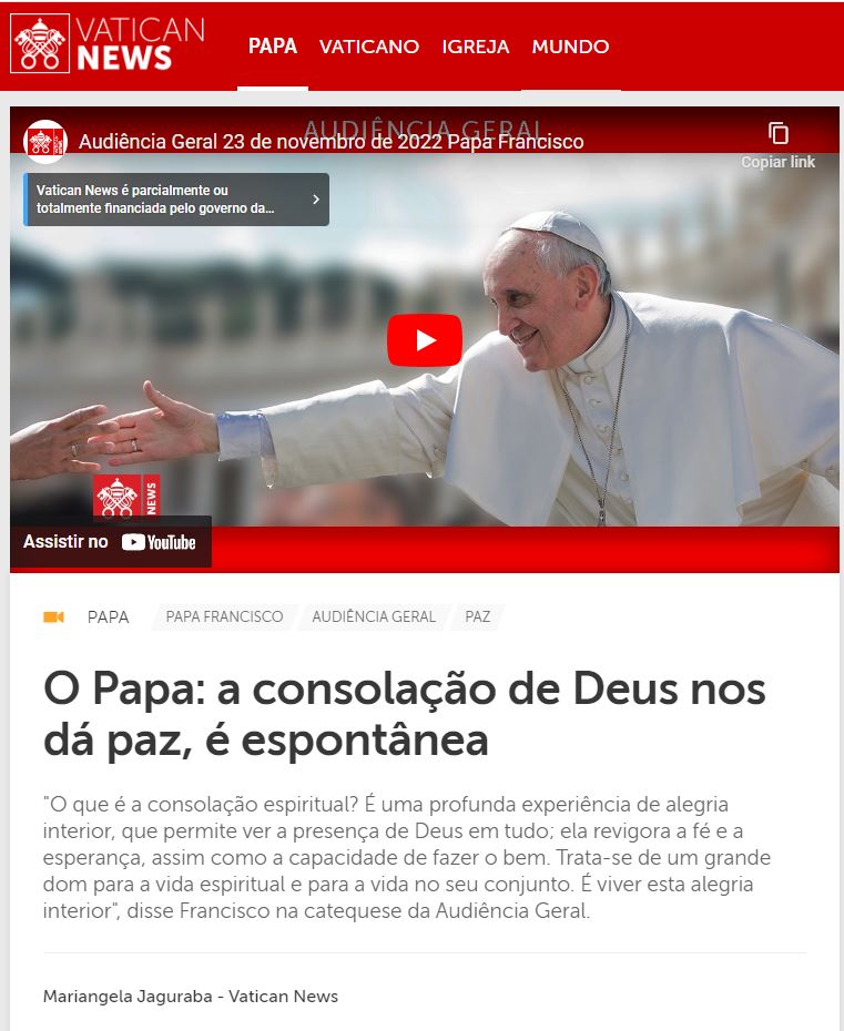 “A consolação” foi o tema da catequese do Papa Francisco na Audiência Geral, desta quarta-feira (23/11), realizada na Praça São Pedro.