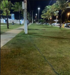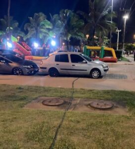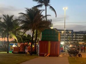 As fotos ao lado mostram um absurdo. Foram tiradas pelo titular deste espaço no último domingo, 18. Em um dos lados da orla, a Prefeitura permitiu que um (ou uma) apadrinhado (a) instalasse diversos brinquedos infláveis tomando conta da calçada e do gramado. Uma gambiarra foi colocada passando pela calçada e pela via com os carros passando por cima até chegar a um poste. Será que a Energisa autorizou? E se autorizou, qual o motivo da Prefeitura não ter liberado para colocar os brinquedos no lado onde está o poste, que é maior e não prejudicaria os pedestres e quem faz caminhadas e corridas no local?