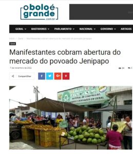 Lagarto: Manifestantes cobram abertura do mercado do povoado Jenipapo Deu no site “O Bolo é Grande”: No domingo, 6, manifestantes realizaram um ato nas ruas e na feira do povoado Jenipapo, para cobrar a abertura do Mercado da região, fechado por falta de ações concretas da gestão da prefeita Hilda Ribeiro, que mantém o mercado fechado há anos.