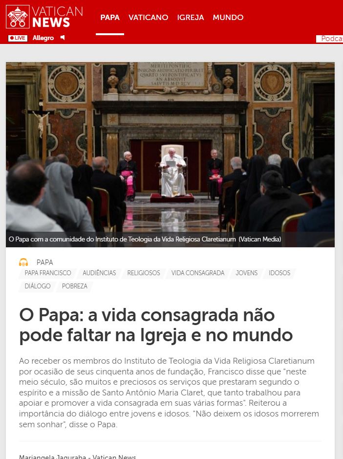 Ouça e compartilhe: https://www.vaticannews.va/pt/papa/news/2022-11/papa-francisco-claretianos-vida-consagrada-jovens-idosos.html