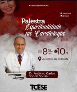 Palestra “Espiritualidade na Cardiologia”, hoje 08 A fim de promover a conscientização da importância da adoção de um estilo de vida saudável entre seus colaboradores, o Tribunal de Contas do Estado (TCE/SE) promove hoje, 08 de novembro, no Auditório da Escola de Contas Conselheiro José Amado Nascimento (ECOJAN), a palestra “Espiritualidade na Cardiologia” com o cardiologista Dr. Antônio Carlos Sobral Sousa. O encontro terá início às 10h.