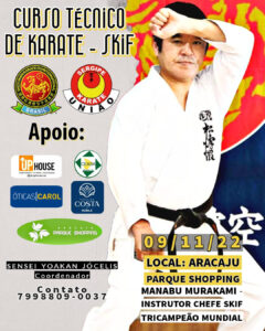 Amanhã, 09 de Novembro em Aracaju: curso técnico de karatê Skif com o tricampeão mundial da SKIF o mestre Manabu Murakami O professor Yoakan jocelis estará trazendo pela segunda vez um seminário internacional de karatê para melhorar cada vez mais o nível técnico do karatê sergipano. Dessa vez será o tricampeão mundial da SKIF o mestre Manabu Murakami, instrutor chefe da skif World , mestre Murakami é uma pessoa que vive karatê passando apenas 33 dias em sua casa pois o restante dos dias é dividido em diversos países do mundo semeado o karatê do. O seminário – que será realizado no Aracaju Parque Shopping – faz parte da escola Skif Brasil onde estará fazendo uma turnê e Sergipe mais uma vez está na rota, além de Goiás, Pará e Rio de Janeiro. Aracaju será no dia 09 a partir das 17h com credenciamento e às 18h com o público faixas coloridas crianças e adultos até às 19h15 e depôs os adultos faixas marrons e pretas das 19h30 as 20h50. Após o evento serão entregues os diplomas, fotografias e autógrafos. Maiores informações 79 98809 – 0037, coordenador sensei Yoakan.