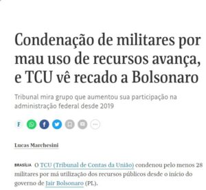 O TCU (Tribunal de Contas da União) condenou pelo menos 28 militares por má utilização dos recursos públicos desde o início do governo de Jair Bolsonaro (PL). Essas condenações na atual gestão têm como origem oito processos abertos de 2014 a 2020, envolvendo 19 oficiais superiores, incluindo 4 generais, o mais alto posto no Exército. Os outros 9 condenados têm patentes mais baixas.
