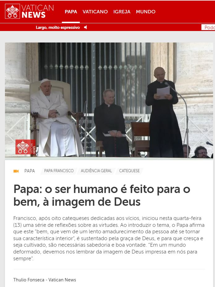 Sorrisos, saudações, acenos e muitas felicitações pelos 11 anos de Pontificado do Papa Francisco. Este foi o clima inicial da Audiência Geral desta quarta-feira, 13 de março, mesma data que marca a eleição do cardeal Jorge Mario Bergoglio no Conclave de 2013. A bordo do papamóvel, o Santo Padre retribui o afeto dos fiéis expressando um dos seus traços mais fortes: a ternura.Ao iniciar a Catequese, o Papa explicou aos fiéis que, devido a um resfriado, ainda não pode ler a catequese e convidou os presentes a escutarem com atenção o conteúdo proposto: “Dou-lhes as boas-vindas, ainda estou um pouco resfriado, por isso pedi ao monsenhor para ler a catequese. Estejamos atentos, acredito que nos fará muito bem!” Toda matéria aqui: https://www.vaticannews.va/pt/papa/news/2024-03/papa-audiencia-geral-catequese-13-marco-2024-virtudes.html
