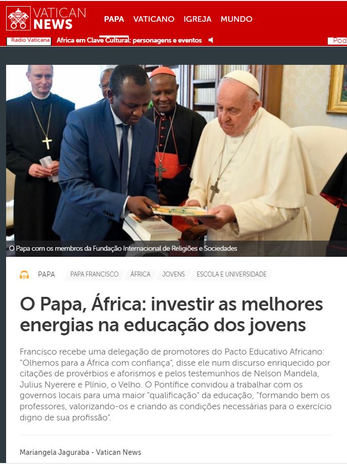 O Papa Francisco recebeu em audiência, no Vaticano, na quinta-feira (1º/06), uma delegação de promotores do Pacto Educativo Africano, membros da Fundação Internacional de Religiões e Sociedades. Em seu discurso, o Papa frisou que o Pacto Educativo Africano é fruto do Simpósio Internacional organizado, em novembro passado, em Kinshasa, na República Democrática do Congo, pela Fundação Internacional de Religiões e Sociedades e pela Universidade Católica do Congo, com o apoio da Conferência Episcopal do Congo. Ouça e compartilhe: https://www.vaticannews.va/pt/papa/news/2023-06/papa-francisco-promotores-pacto-educativo-africano-sociedades.html