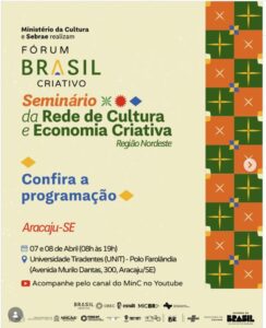 Fórum Brasil Criativo-Região Nordeste e Seminário da Rede de Cultura e Economia Criativa acontecem nestas terça e quarta-feira em Aracaju. Iniciativa do MinC com apoio do Sebrae Aracaju recebe nestas terça e quarta-feira, 7 e 8 de abril, o Fórum Brasil Criativo – Região Nordeste, iniciativa do Ministério da Cultura (MinC), realizado em conjunto com o Seminário da Rede de Cultura e Economia Criativa, em parceria com o Serviço Brasileiro de Apoio às Micro e Pequenas Empresas (Sebrae). O encontro acontece na Universidade Tiradentes, no polo Farolândia, em Aracaju, reunindo gestores públicos, pesquisadores, empreendedores e agentes culturais e criativos em torno do fortalecimento da economia criativa, com foco no audiovisual e seus ecossistemas. A ação integra a série de fóruns regionais que percorrem as cinco regiões do país, com o objetivo de ampliar o diálogo entre diferentes atores do setor e contribuir para a elaboração do Plano Nacional de Economia Criativa (Plano Brasil Criativo). Promovido pela Secretaria de Economia Criativa do MinC, o Fórum se consolida como espaço de articulação, escuta qualificada e construção coletiva de políticas públicas voltadas ao desenvolvimento econômico, social, ambiental, cultural e territorial.