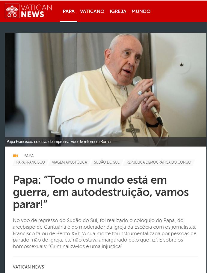 NESTE DOMINGO (5/2), O PONTÍFICE DECLAROU A JORNALISTAS QUE O ACOMPANHAVAM A BORDO DO AVIÃO PAPAL, NO RETORNO DA VIAGEM À REPÚBLICA DEMOCRÁTICA DO CONGO E AO SUDÃO DO SUL, PAÍSES DA ÁFRICA: