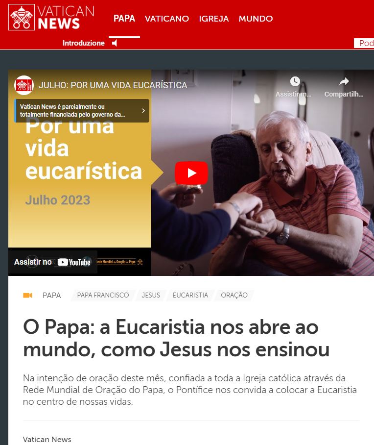 “Por uma vida eucarística” é o título do vídeo do Papa Francisco com a intenção de oração para este mês de julho. Na mensagem de vídeo divulgada, nesta segunda-feira (03/07), o Santo Padre diz que “se ao sair da missa estás como entraste, alguma coisa não funciona”. Na intenção de oração deste mês, confiada a toda a Igreja católica através da Rede Mundial de Oração do Papa, o Pontífice nos convida a colocar a Eucaristia no centro de nossas vidas. Ouça e compartilhe: