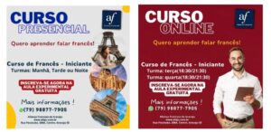 Os cursos de francês da Aliança Francesa estão com Matrículas Abertas, cujas aulas começam a partir do dia 07 de agosto, para os cursos presencialmente ou online ao vivo. Você escolhe! E tem mais! Traga seu amigo para estudar na AF e tenha descontos de até 25% na mensalidade! Lembrando que temos planos de descontos de 5%, 10% e 20% quer saber mais?