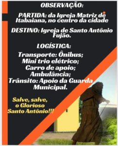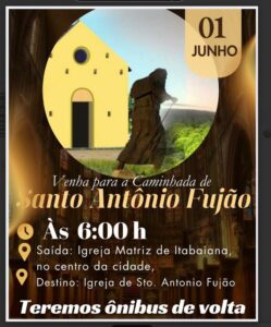 No próximo domingo, 1° de Junho Peregrinação de Santo Antônio Fujão. Início às 6h com a Santa Missa na Paróquia Santo Antônio e Almas (Itabaiana/SE), logo após, peregrinação à Capela Santo Antônio, Povoado Igreja Velha, seguida da Missa.