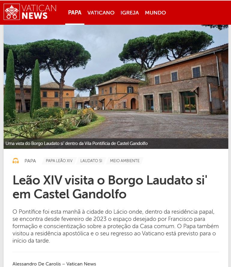 Uma nova saída surpresa do Papa animou esta quinta-feira, 29 de maio, quando uma fila de carros deixou o Vaticano em direção à residência papal de Castel Gandolfo, conforme referido pela Sala de Imprensa da Santa Sé. Leão XIV chegou à cidade dos Castelos Romanos na parte da manhã para visitar o Borgo Laudato si’, o projeto criado por Francisco em 2023 na área das Vilas Pontifícias como um espaço de formação sobre os temas da Casa comum, um exemplo daquela “ecologia integral” na base da encíclica publicada há dez anos. Nesta ocasião, Leão XIV também visitou a residência apostólica, que Francisco transformou num centro museológico aberto aos visitantes desde 2016. O Papa deve retornar ao Vaticano no início da tarde.