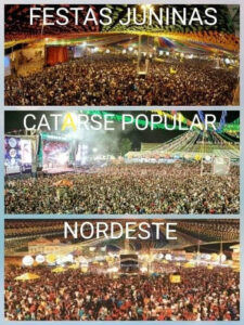 Assim, passado esse tormentoso biênio de providencial suspensão, ou de imperativo recesso, das periódicas, atrativas, recreativas e irresistíveis temporadas de entretenimento lúdico-junino, isto é, mais precisamente, a partir de 30 de maio de 2023, passando por 2024, o represado, cumulativo, recarregado e colossal arsenal de megatônica energia psicofísico-emocional dos inveterados, juramentados, compulsivos e insaciáveis festeiros acabaria de explodir, feito um bem-comparado “bing bang”, irradiando, onidirecional e continuamente, ondas de alegria, emoção e calor humano, que transpassam, envolvem, permeiam e extrapolam, em cadeia, todos os seguimentos do complexo e extenso tecido humano brasileiro, assumindo plena, total e irrestrita dimensão nacional. É, pois, o que se poderia chamar, sem exagero de linguagem figurada, de uma espécie de inevitável e incontrolável “CATARSE POPULAR” de euforia, amor, paz, vibração, deleite, afetividade, fraternidade, felicidade e de outros sentimentos reprimidos pela imperiosa, temerosa, inexorável e inusitada tragédia pandêmica da Covid-19, prestes a acontecer. Ainda, em linguajar metafórico, pode se dizer: depois da tempestade, eis que surge sempre a bonança. Ademais, “nenhum ser humano é de ferro”, como afirma o surrado dito popular. Ou mesmo, em fraseado adloquial, “o humano — para viver, sobreviver e viver bem — não só precisa da energia construtiva do trabalho, mas também imprescinde do elemento balsâmico da diversão”.