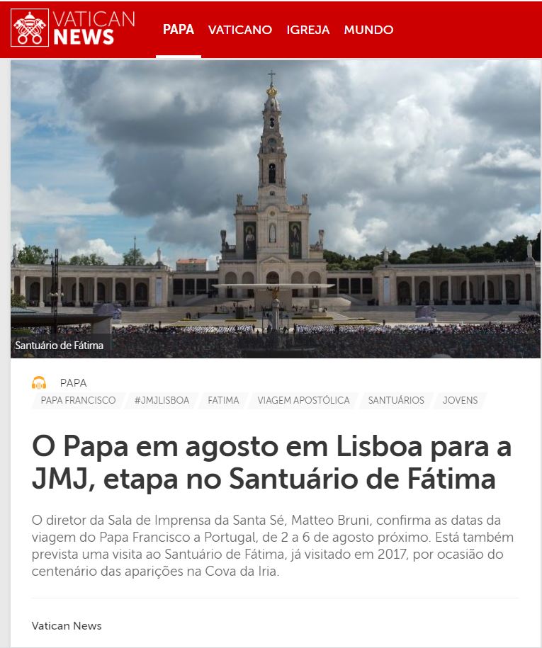 Uma etapa ao Santuário de Fátima está também prevista na viagem que o Papa Francisco fará a Lisboa, Portugal, por ocasião da próxima Jornada Mundial da Juventude. O anúncio foi feito pelo diretor da Sala de Imprensa da Santa Sé, Matteo Bruni, explicando que: “Por ocasião da próxima Jornada Mundial da Juventude, e aceitando o convite das autoridades civis e eclesiais de Portugal, Sua Santidade o Papa Francisco irá a Lisboa de 2 a 6 de agosto deste ano, fazendo uma visita ao Santuário de Fátima no dia 5 de agosto”. Ouça e compartilhe:
