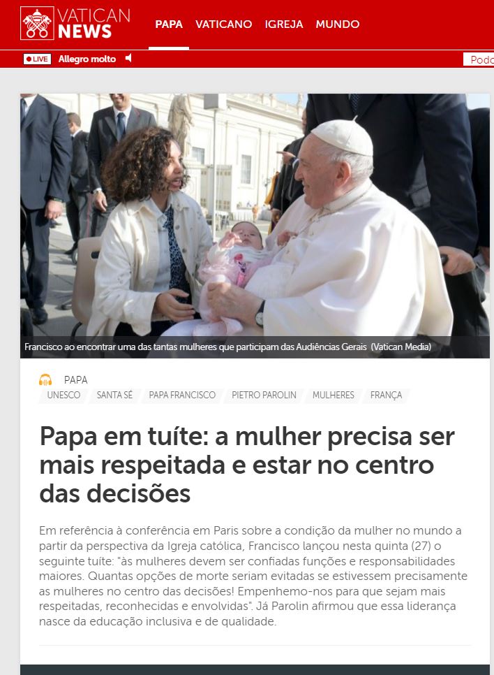 Ouça a reportagem e compartilhe: https://www.vaticannews.va/pt/papa/news/2022-10/papa-francisco-tuite-mulheres-unesco-caritas-internacional-2022.html