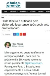 Lagarto: Hilda Ribeiro é criticada pelo eleitorado lagartense após pedir voto em Bolsonaro Deu no site “O Bolo é Grande”: Na quarta-feira, 19, a prefeita de Lagarto, Hilda Ribeiro, através da rede social Twitter, pediu votos aos lagartenses para Bolsonaro. “Minha gente, eu quero reafirmar e reforçar o pedido: para que no próximo dia 30, vocês votem no nosso presidente @jairbolsonaro. Para que o País, o Estado, mas especialmente a nossa cidade continue avançando. Vamos Juntos!”, escreveu Hilda. A publicação foi compartilhada no Instagram de uma página de notícias do município de Lagarto, e já contabiliza mais de mil comentários, em sua maioria, criticando Hilda Ribeiro. “Quais são esses avanços, senhora Hilda?”, perguntou um internauta. Outro disse: “Avançando só se for pra você”. “Nunca vamos fazer isso, vá esperando”, afirmou uma seguidora da página.