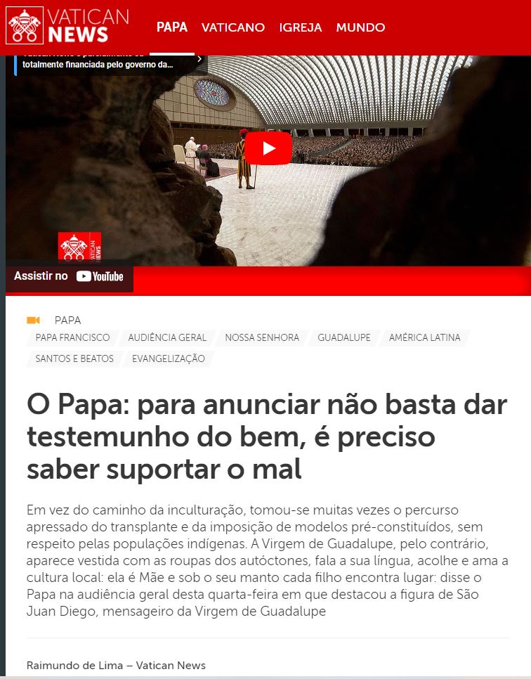 Na audiência geral desta quarta-feira, 23 de agosto, numa Sala Paulo VI repleta de fiéis e peregrinos, o Papa retomou o percurso catequético sobre a paixão por evangelizar. Neste percurso para redescobrir a paixão pelo anúncio do Evangelho, na catequese que teve como título O anúncio na língua materna: são Juan Diego, mensageiro da Virgem de Guadalupe, Francisco lançou seu olhar para as Américas. Ouça a reportagem com a voz do Papa e compartilhe: https://www.vaticannews.va/pt/papa/news/2023-08/papa-francisco-audiencia-geral-23-agosto-2023-virgem-guadalupe.html